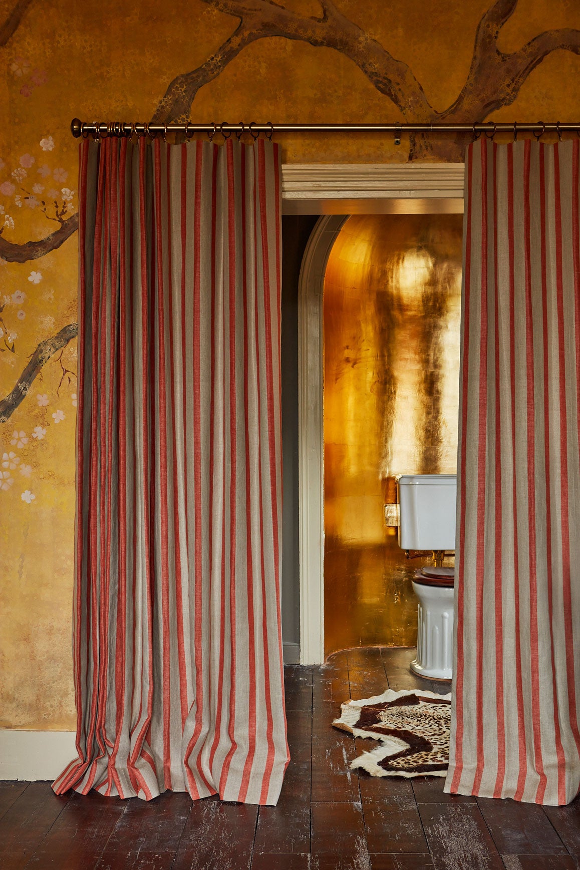 Envelop yourself in our linens by coordinating your wallcovering with drapery, upholstery and accessories to create a dramatic look as seen in the drawing room of Harpsden Court where our Dacha print in Tobacco has been used for walling and matching roman blinds.