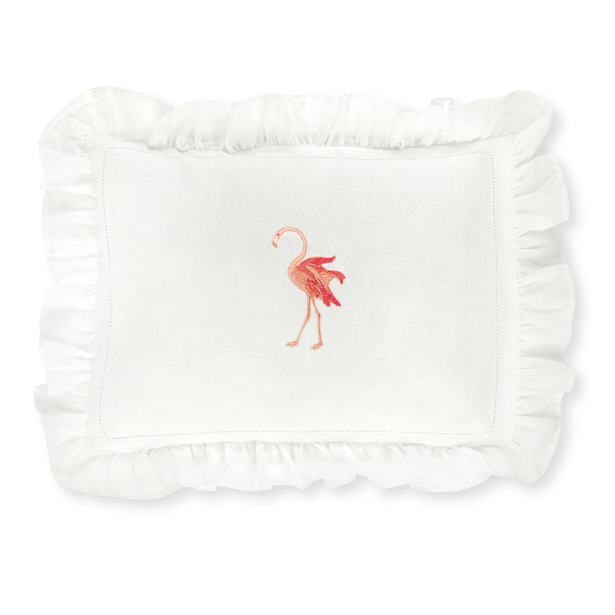 Volga’s boudoir pillow with elegant frill edge and playful Flamingo embroidery. Comes in an Ivory White linen gift bag featuring an embroidered Volga Linen logo and tied with a Terracotta ribbon.