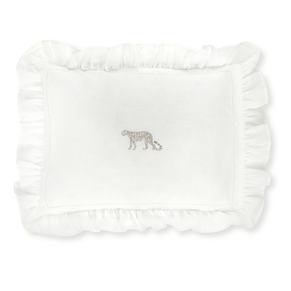 Volga’s boudoir pillow with elegant frill edge and unique Leopard embroidery. Comes in an Ivory White linen gift bag featuring an embroidered Volga Linen logo and tied with a Terracotta ribbon.