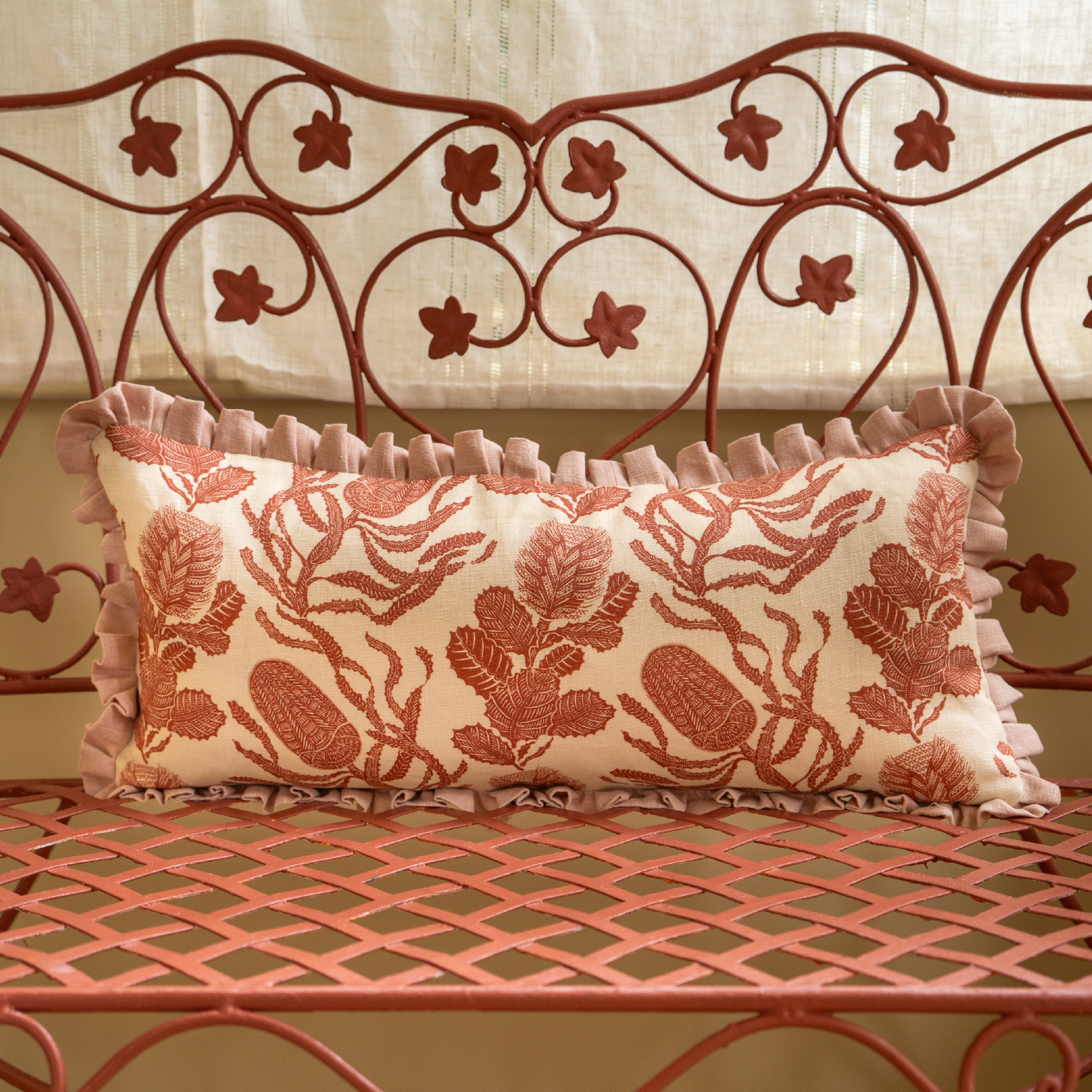 Cape Botanical Print Cushion in Terracotta with English Rose Frill