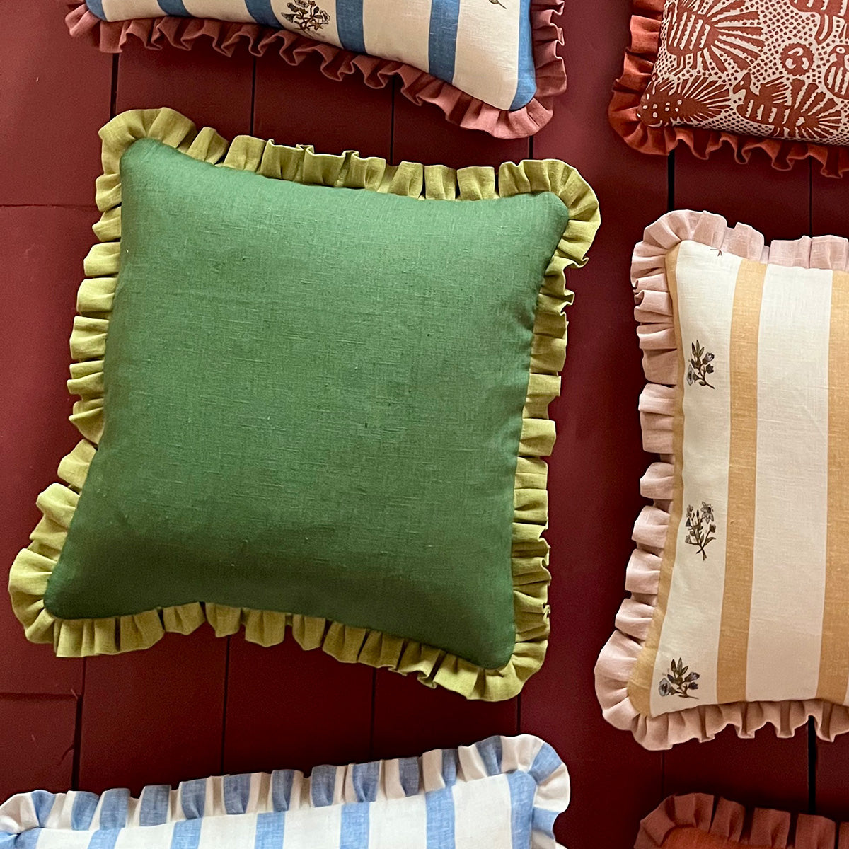 Cushion crafted from Volga’s Constantia Green plain weave finished with a frill in Moss Green.