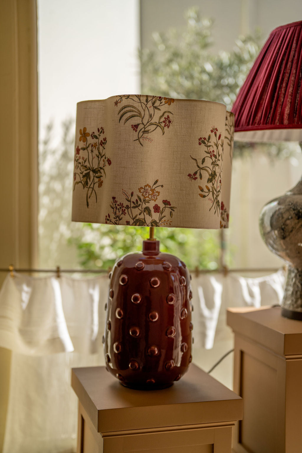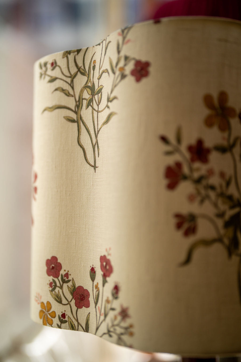 Our Daisy scallop-shaped lampshade in Flax and Field Flower, Scarlet printed linen is handmade in England by local artisans.