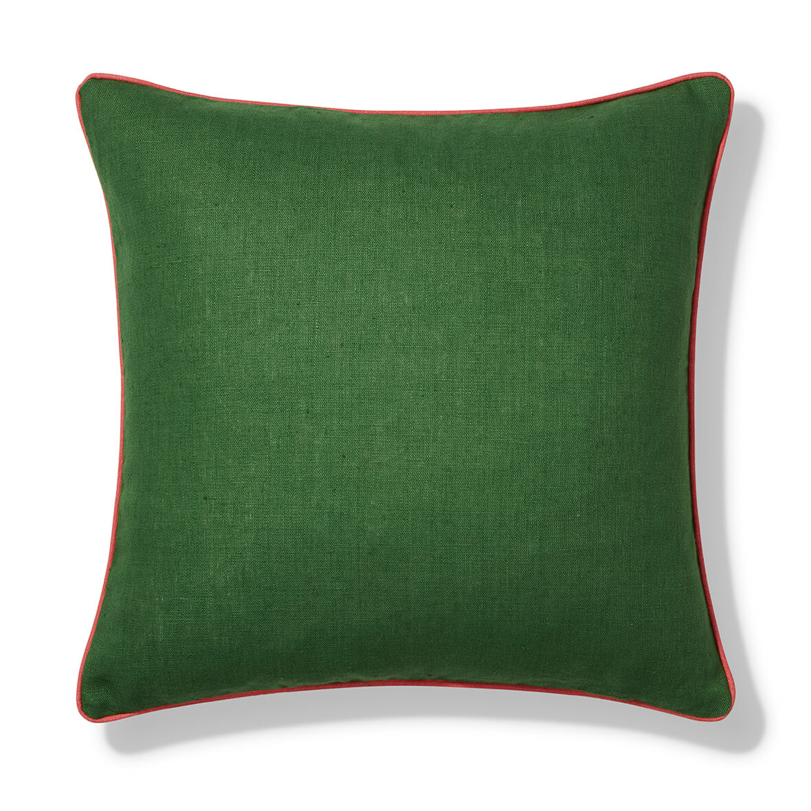 Cushion crafted from Volga Emerald plain weave linen with piping in Coral. 100% LINEN. Cushion size: 50x50cm.