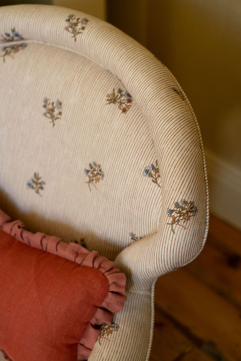 Our Flax & Field Posy Pinstripe printed linen is used on both sides of the cushion and piped in Chambray Blue. Our cushions are handmade exclusively for us in England. All cushions come with a feather and down filled inner pad and are finished with a concealed zip.