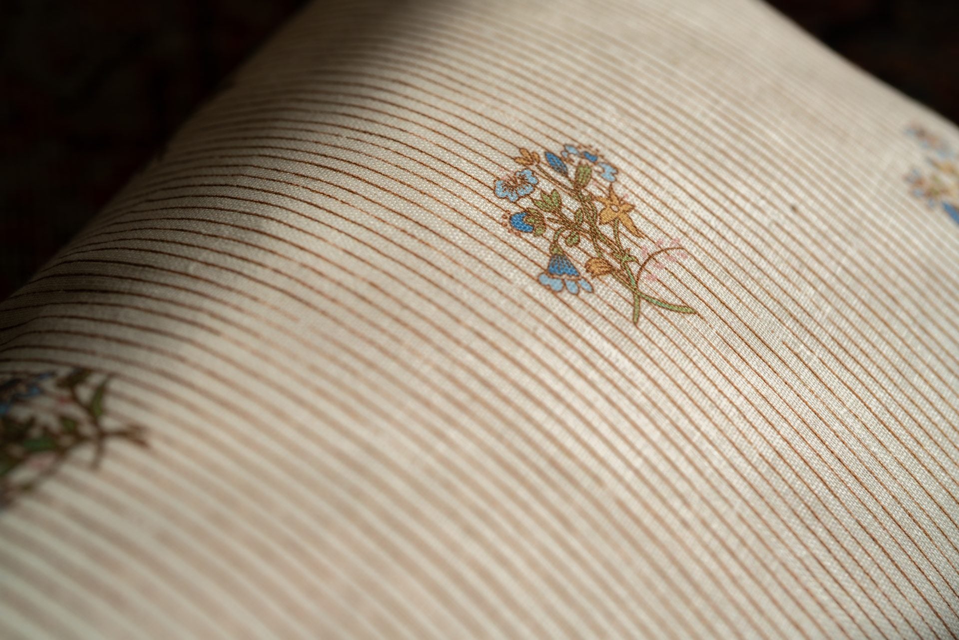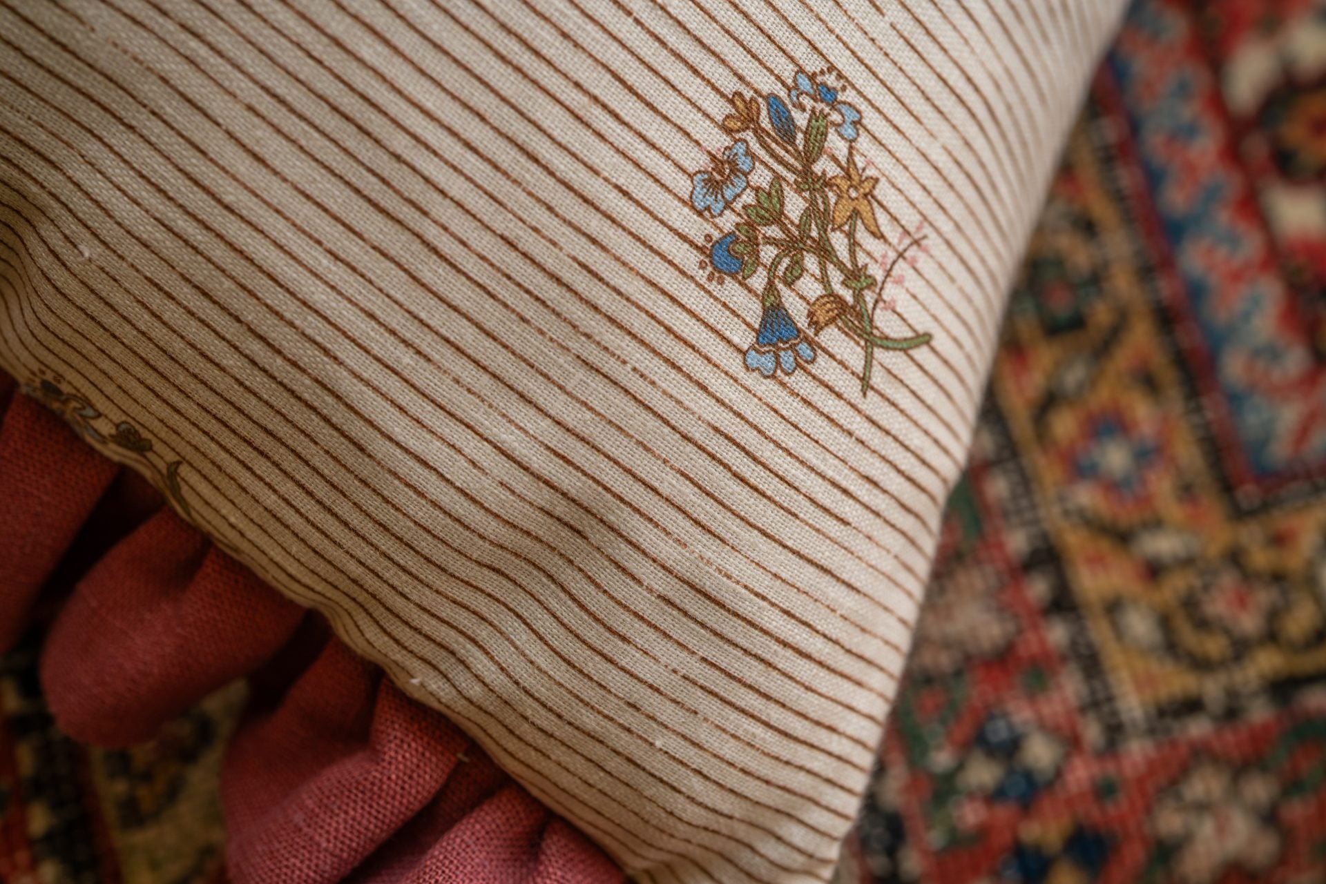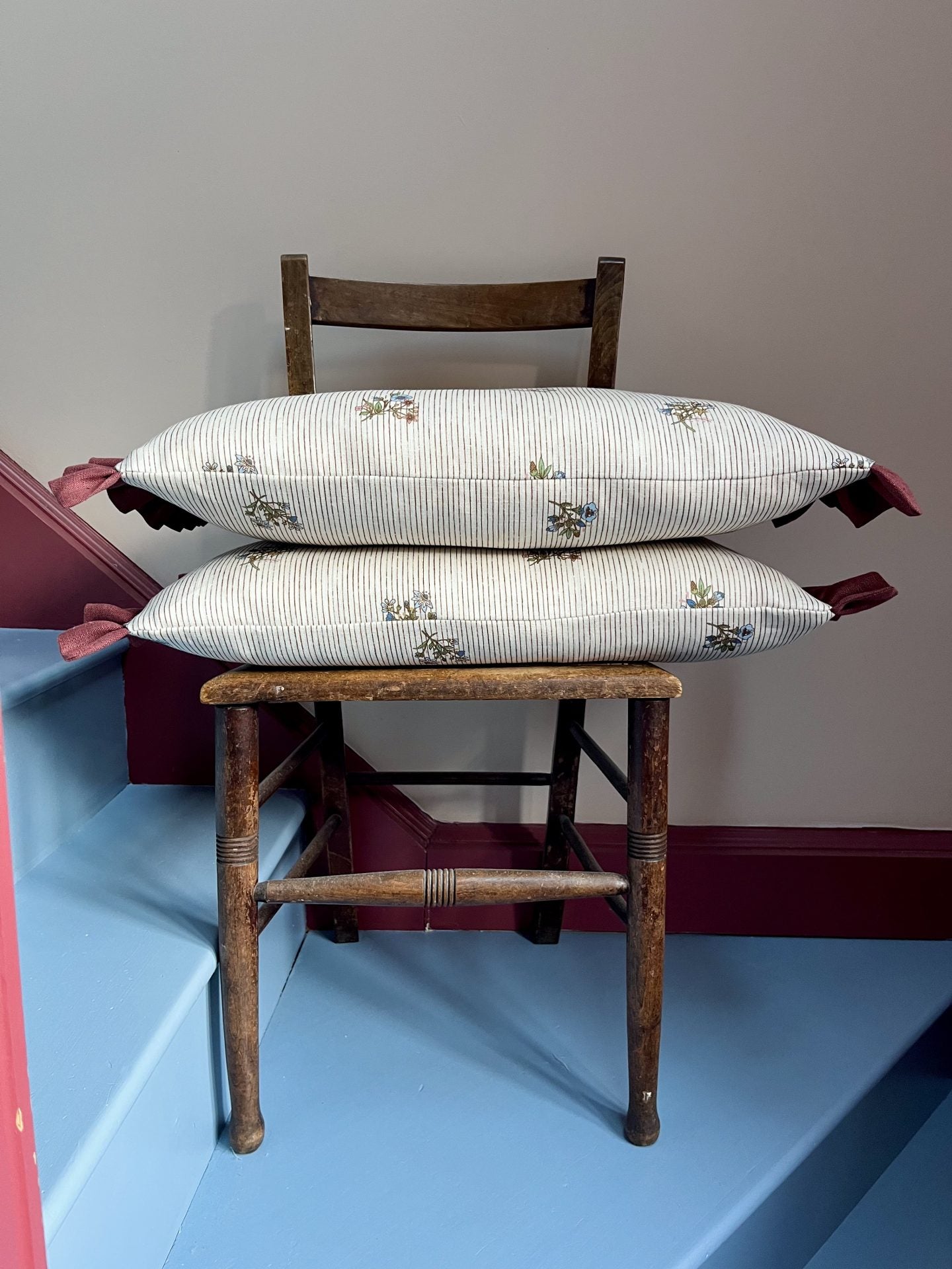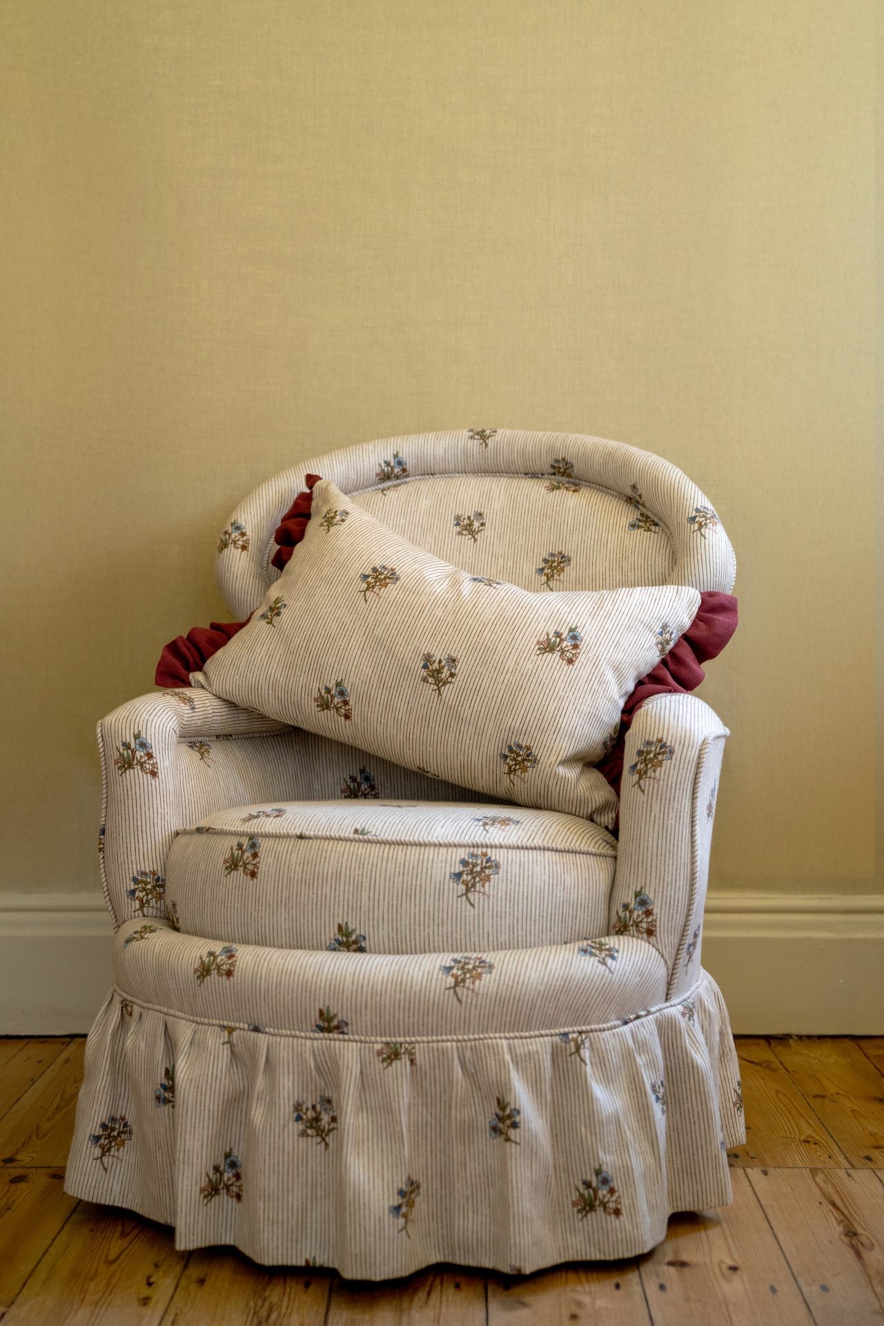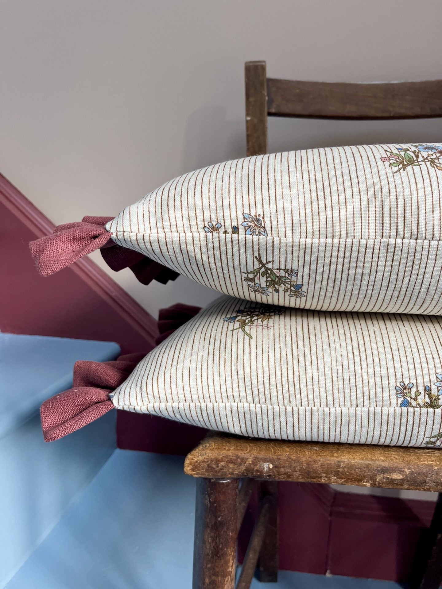 Cushion crafted from Volga’s Flax & Field Posy Pinstripe finished with a frill in Marsala. Handmade by Katy Takla in England. All cushions come with a feather and down filled inner pad and are finished with a concealed zip.