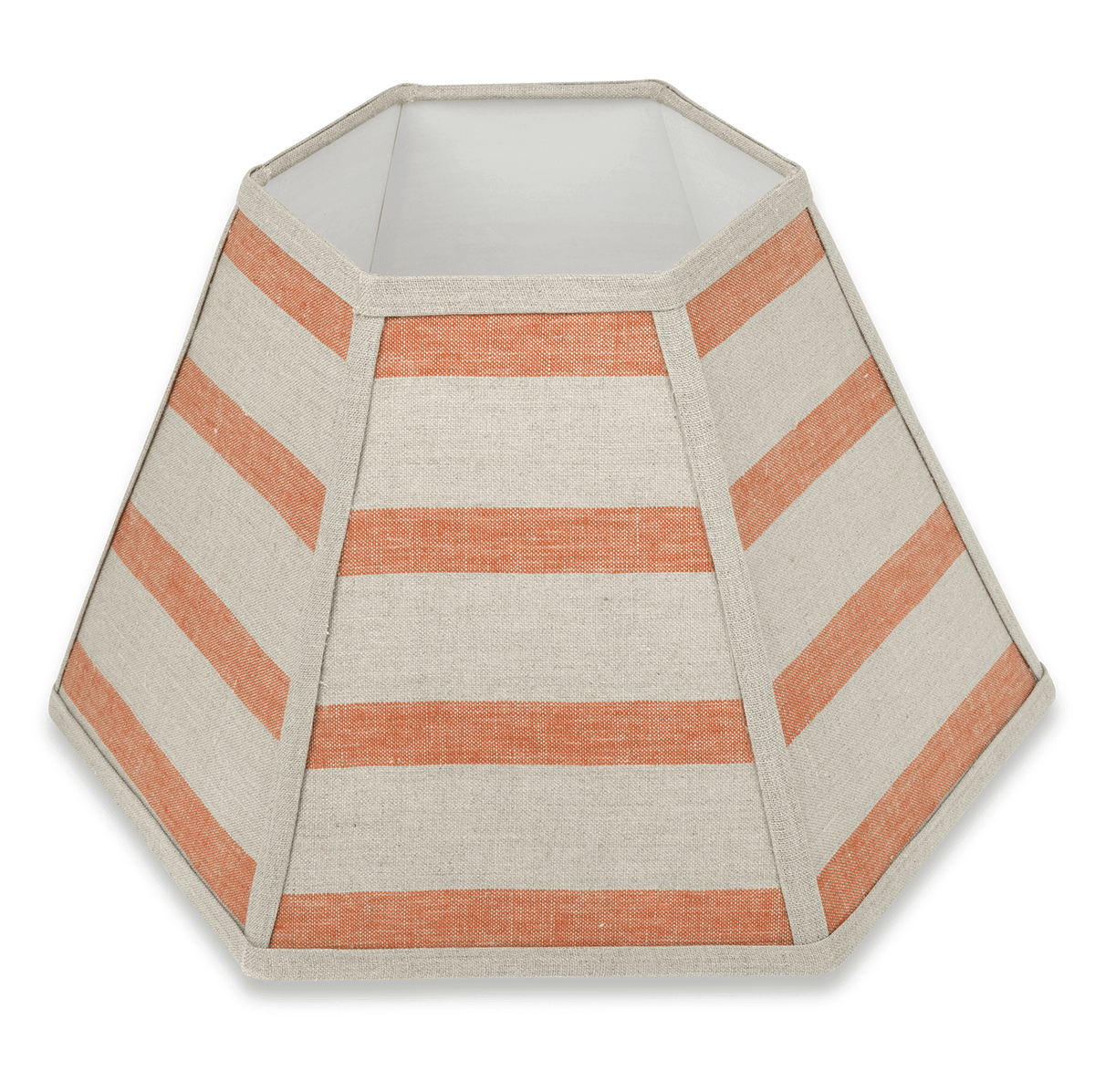 Our Hexagonal lampshade in Terracotta/Natural Bold Stripe Linen is handmade in England by local artisans. This lampshade is in stock and ready to ship.