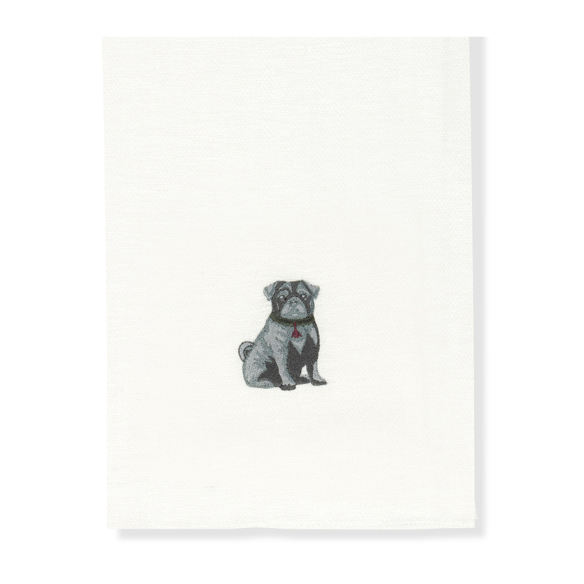 Our French Red kitchen tea towel features a unique embroidery of a Pug dog in Tassel Collar. Our washed linen towels are soft, fast-drying and durable.