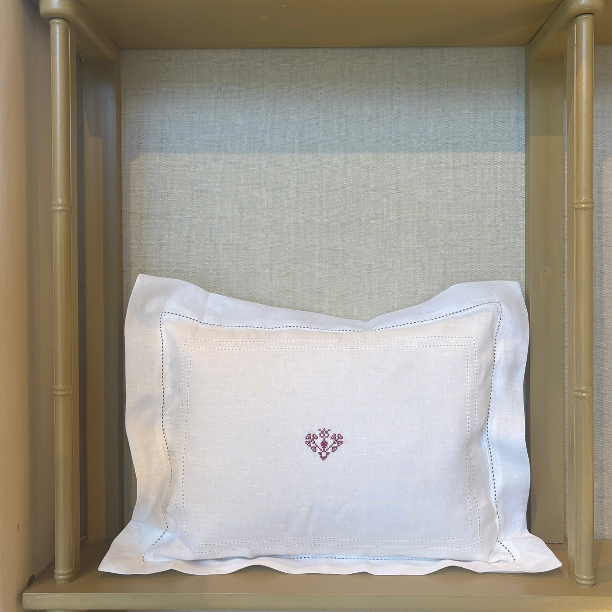 Elizaveta Boudoir Pillow in Ivory White Hemstitch with Crossed Heart Embroidery