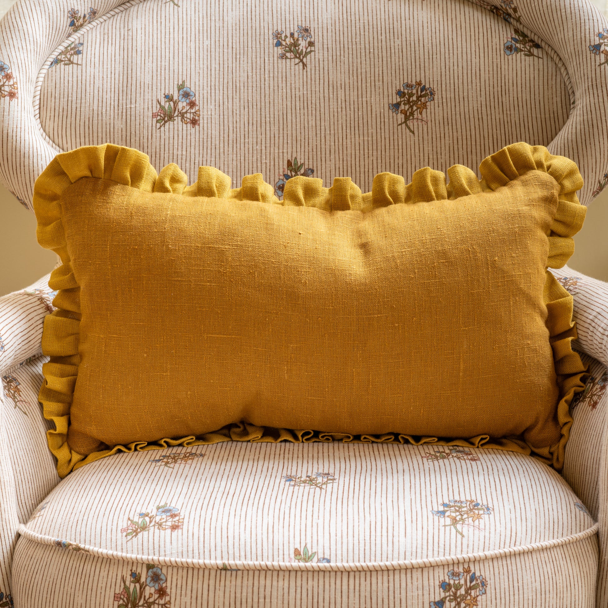 Cushion crafted from Volga’s Old Gold Linen and finished with an Ochre frill edge. Our cushions are handmade exclusively for us in England. All cushions come with a feather and down filled inner pad and are finished with a concealed zip.