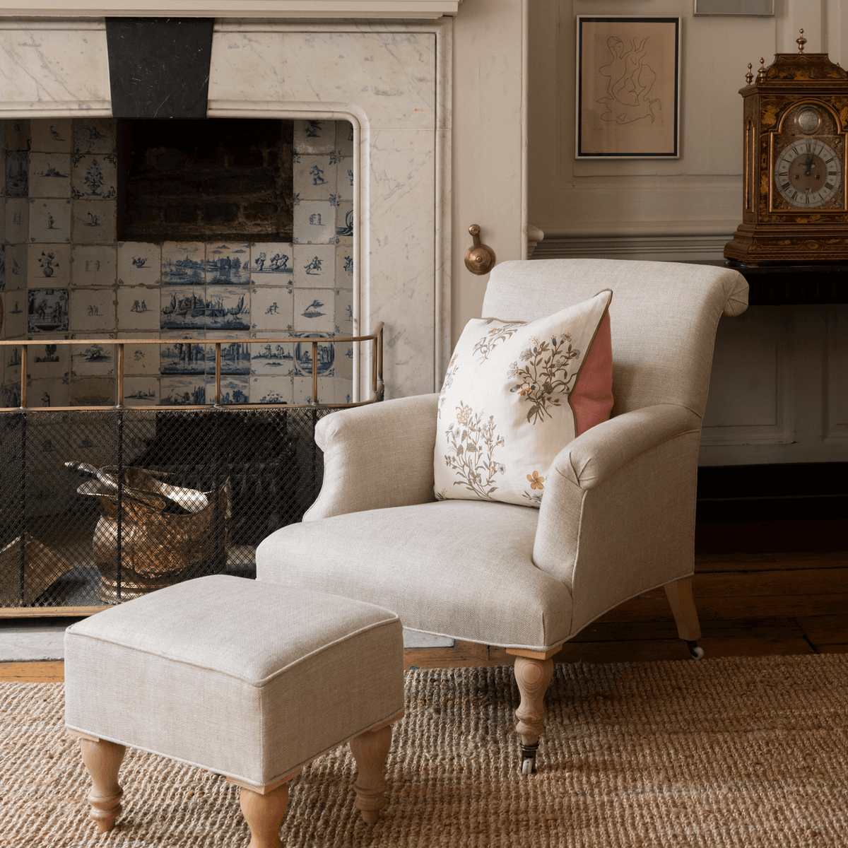 Our petite footstool with self-piping trim and finished with turned legs. Offers versatility as a stand alone piece or coordinates perfectly with our Boudoir armchair.