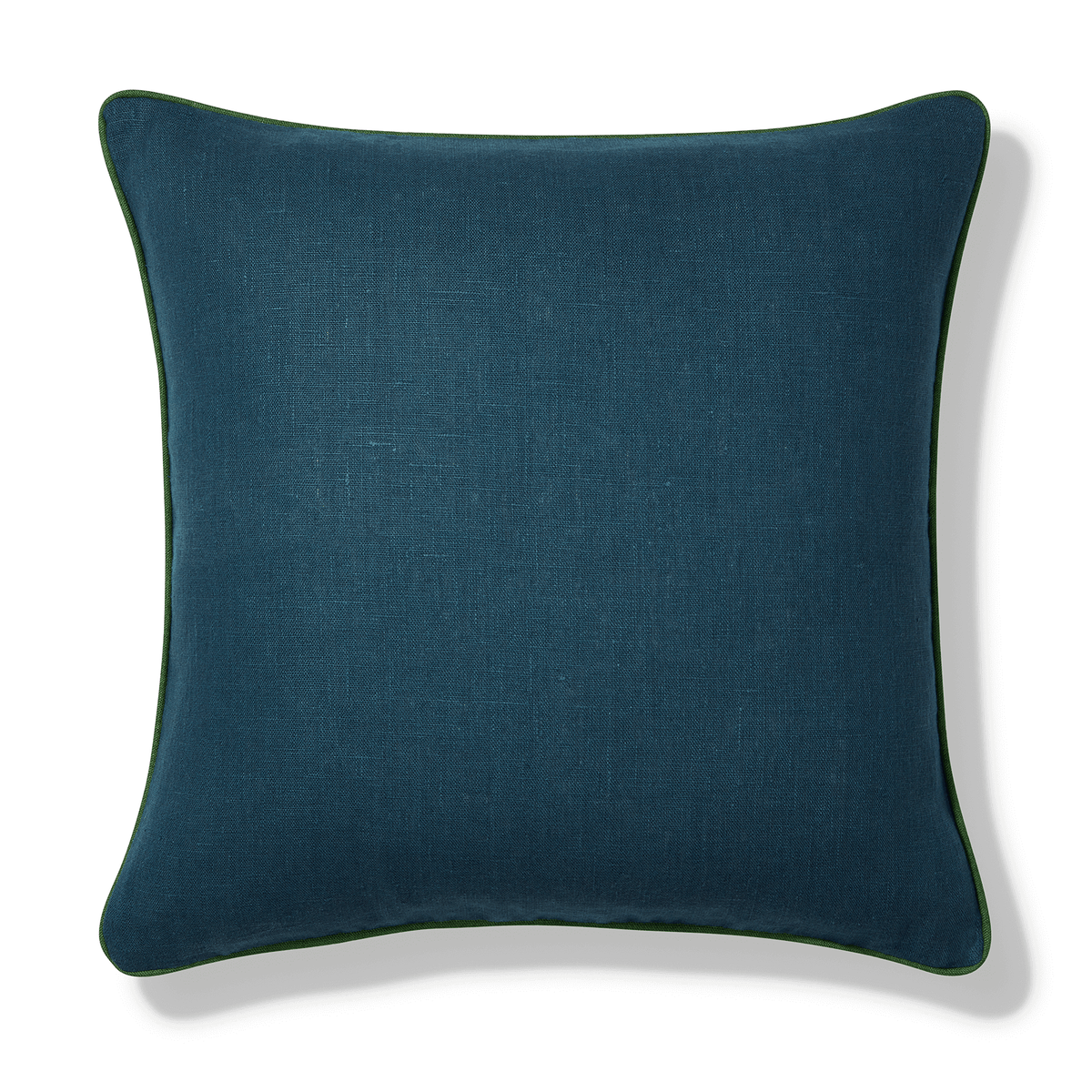 Cushion crafted from Volga Prussian Blue plain weave with piping in Emerald. 100% Linen. Our cushions are handmade exclusively for us in England. All cushions come with a feather inner pad.
