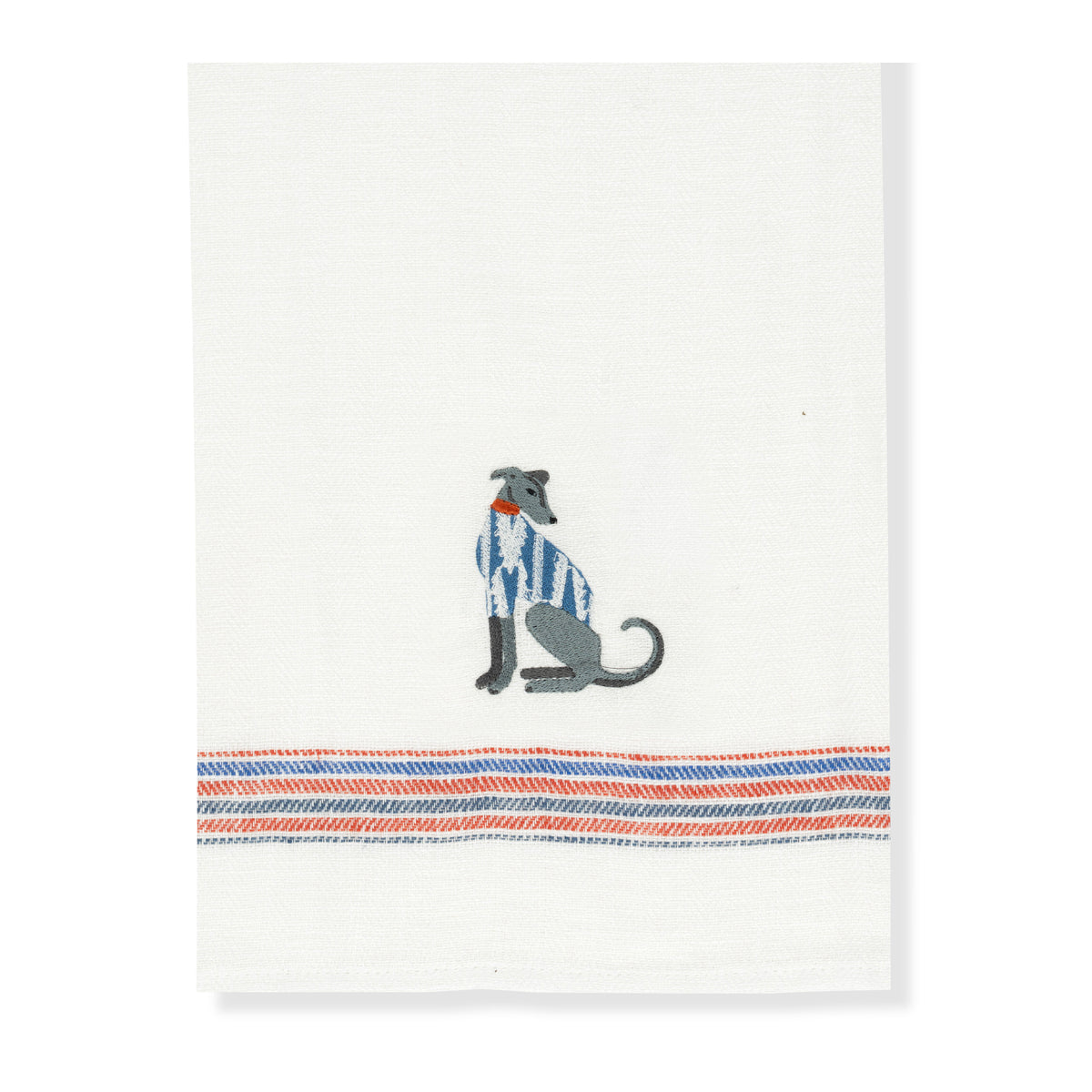 Our French Red & Blue kitchen tea towel features a unique embroidery of a Lurcher dog in Cornflower Blue Shashka Printed Jumper. Our washed linen towels are soft, fast-drying and durable.
