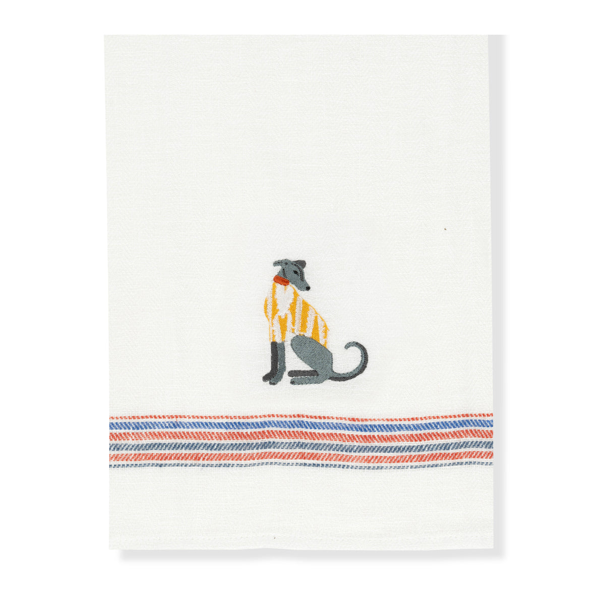 Our French Red & Blue kitchen tea towel features a unique embroidery of a Lurcher dog in Ochre Shashka Printed Jumper. Our washed linen towels are soft, fast-drying and durable.