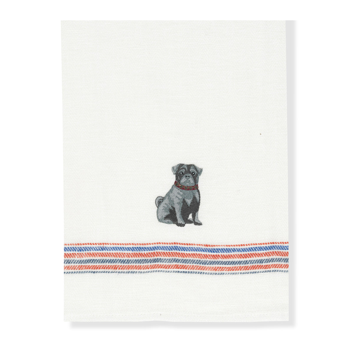 Our French Red & Blue kitchen tea towel features a unique embroidery of a Pug dog in Gem Stone Collar. Our washed linen towels are soft, fast-drying and durable.