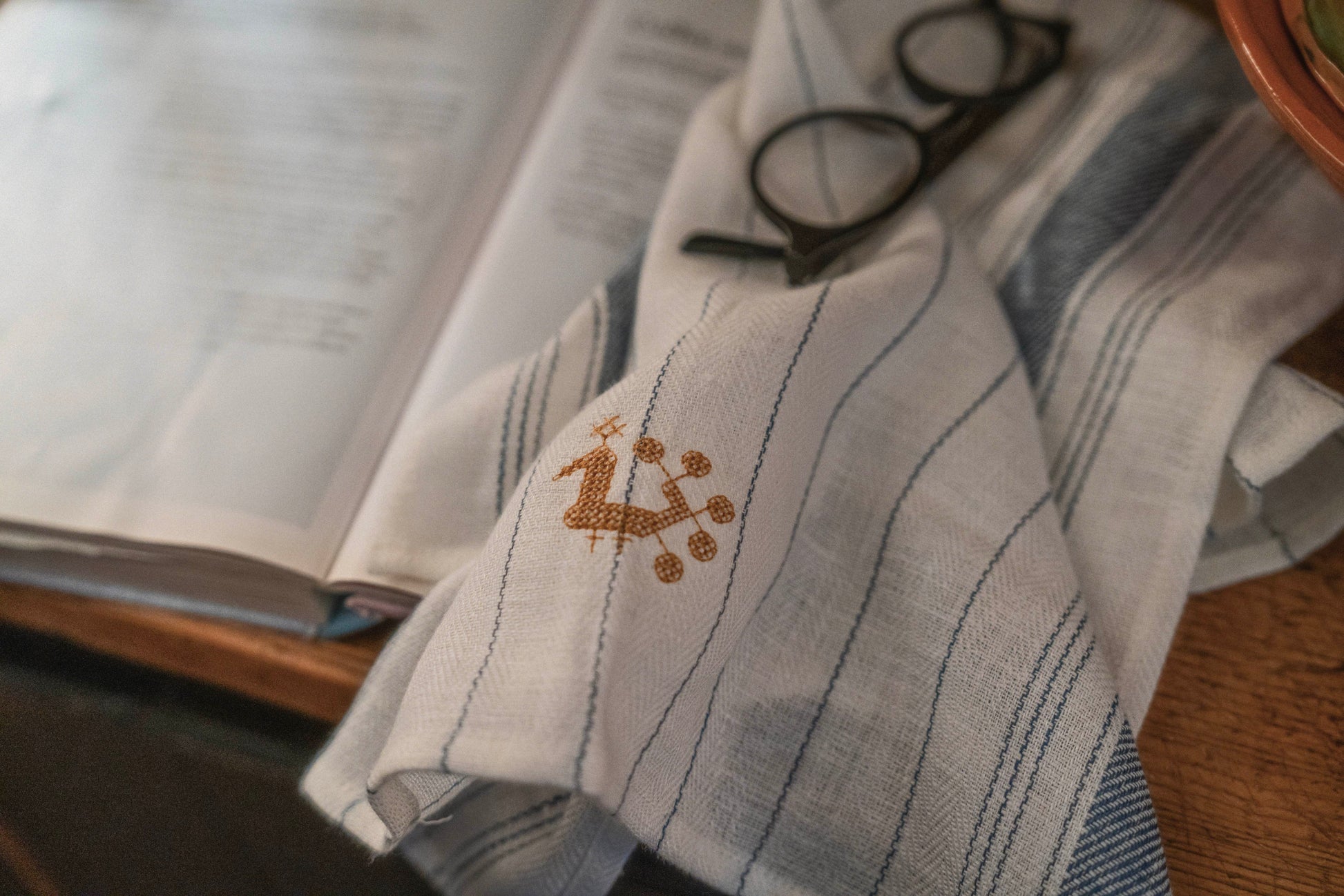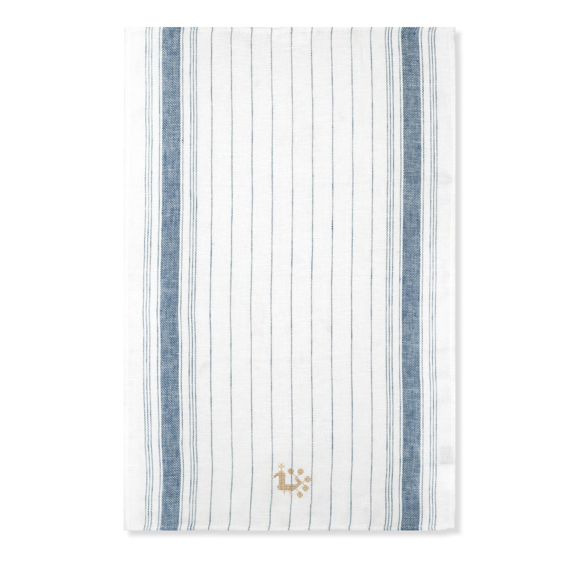 Inherently robust, linen is also fast-drying, making it ideal for day-to-day use in the kitchen. This set of two kitchen tea towels feature a classic stripes in French blue tones. These washed towels are our softest yet and are embroidered with the Volga Cockerel in Antique Gold.