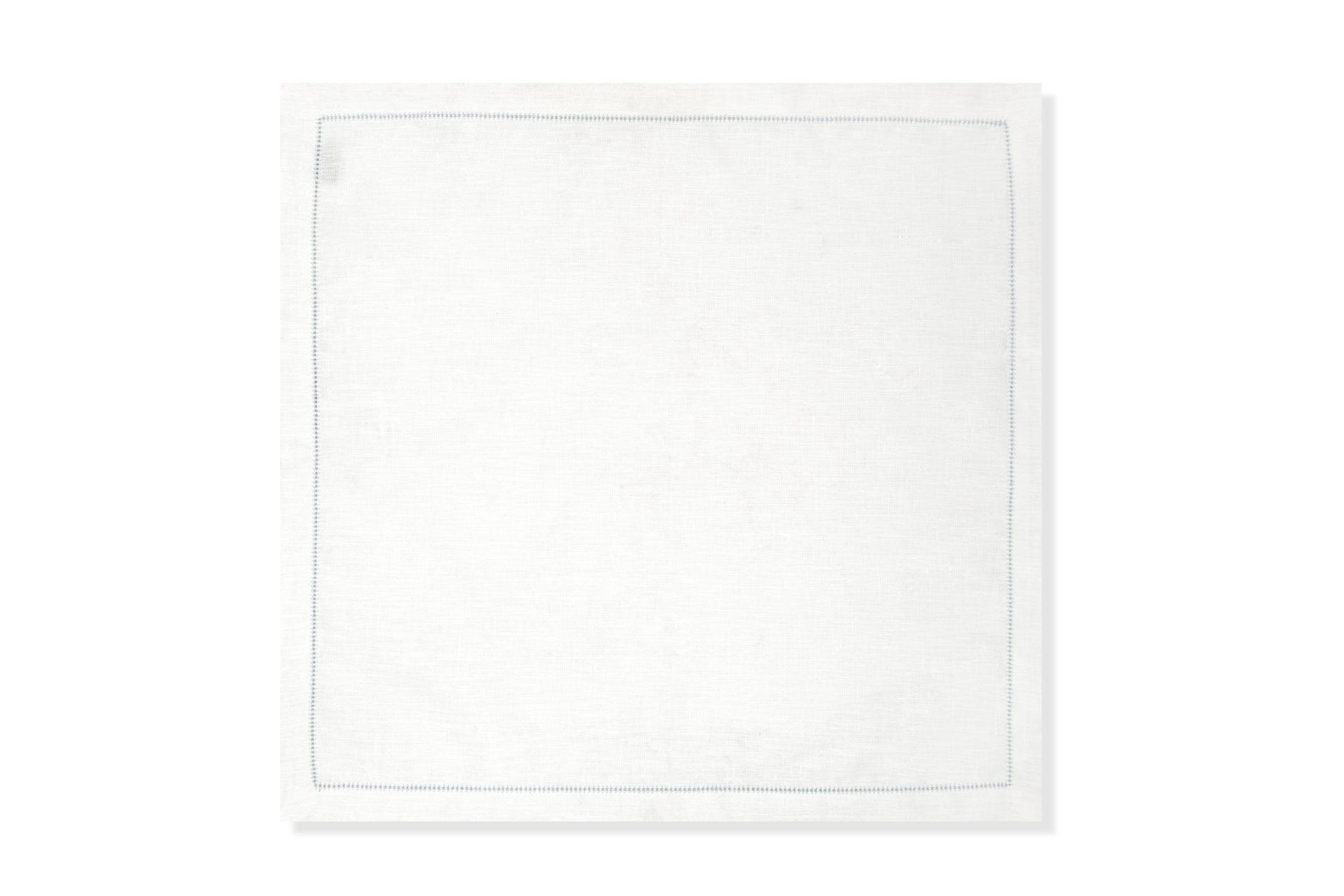 Elevate your dining experience with our exquisite hemstitch napkins, the perfect complement to any table setting. These Ivory White napkins are crafted from the finest linen featuring intricate contrast drawn thread embroidery in Sky Blue.