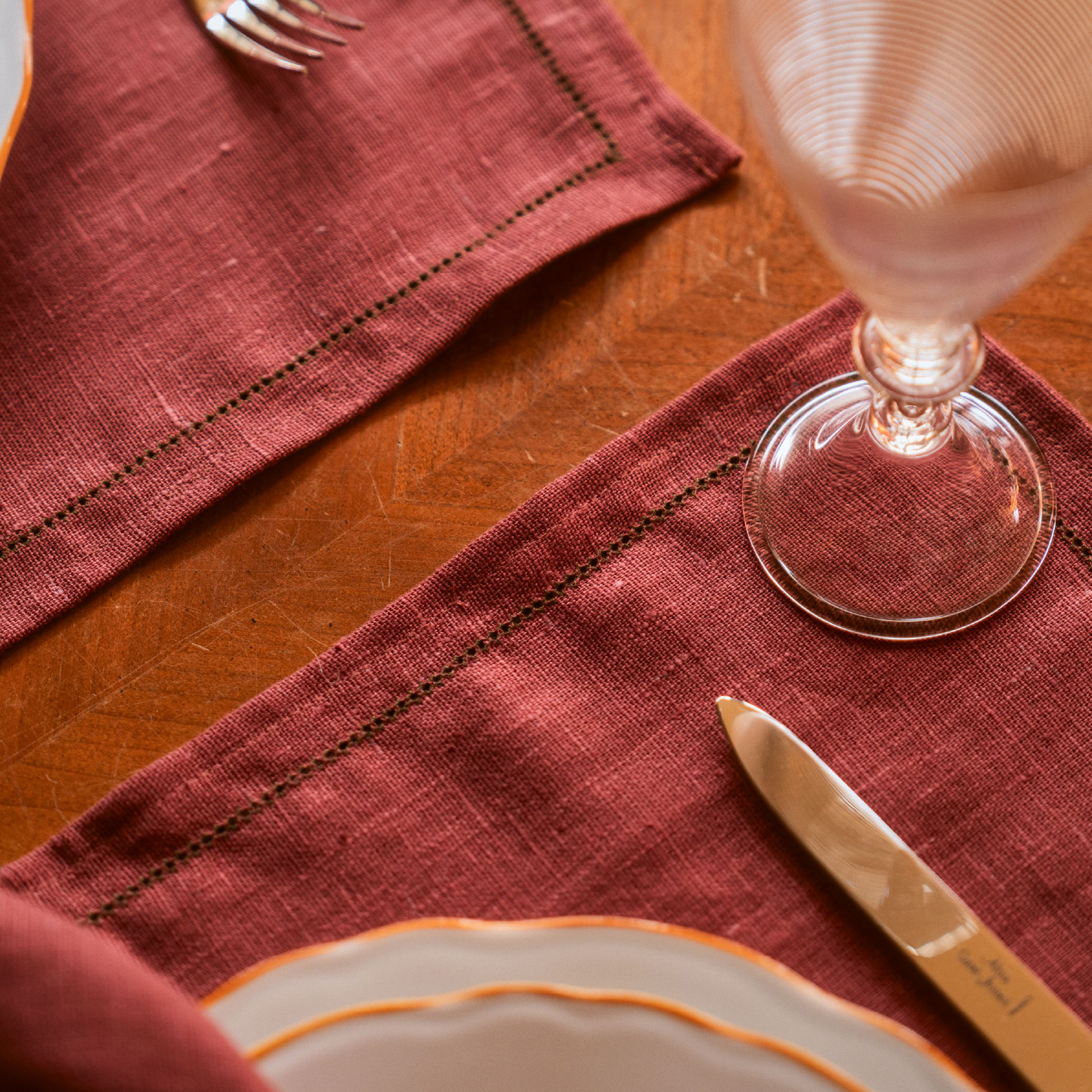 Elevate your dining experience with our Marsala placemats featuring intricate Fern Green hemstitch detailing, the perfect complement to any table setting. These placemats are crafted from the finest linen. A perfect gift when monogrammed.