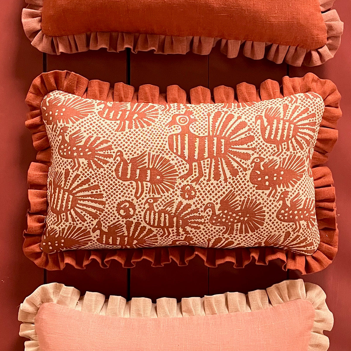 Cushion crafted from Volga’s Sirin Print in Terracotta finished with a frill in Terracotta.