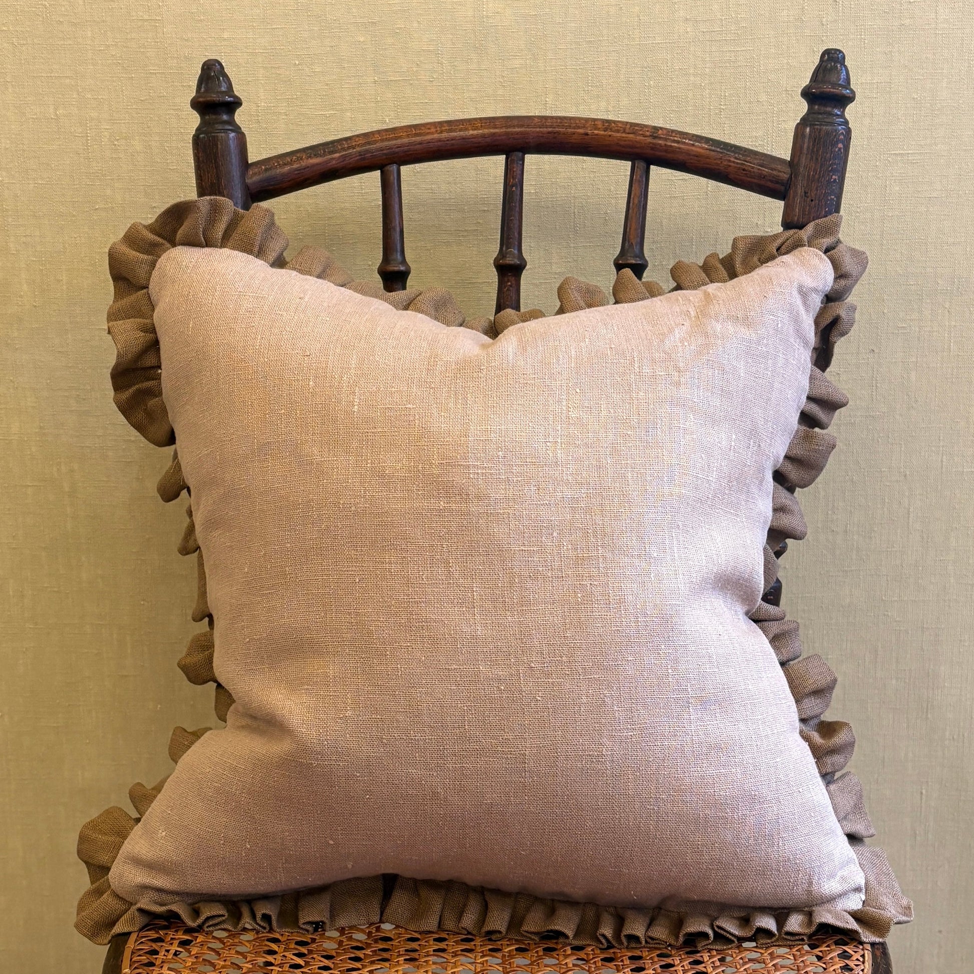 Cushion crafted from Volga’s Tawny Gold Linen and finished with a Bronze frill. Our cushions are handmade exclusively for us in England. All cushions come with a feather and down filled inner pad and are finished with a concealed zip.