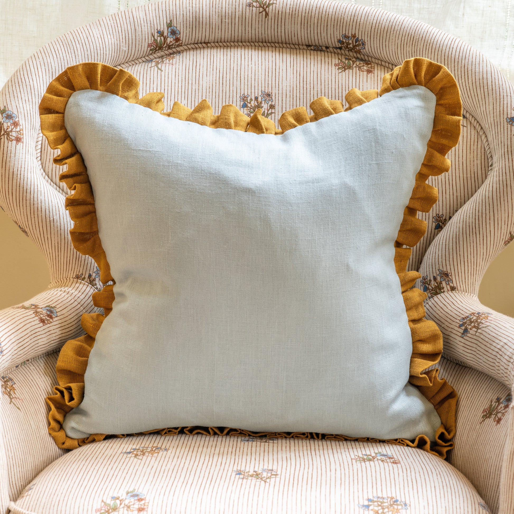 Cushion crafted from Volga’s Parma Grey Linen and finished with an Antique Gold frill. Our cushions are handmade exclusively for us in England. All cushions come with a feather and down filled inner pad and are finished with a concealed zip.