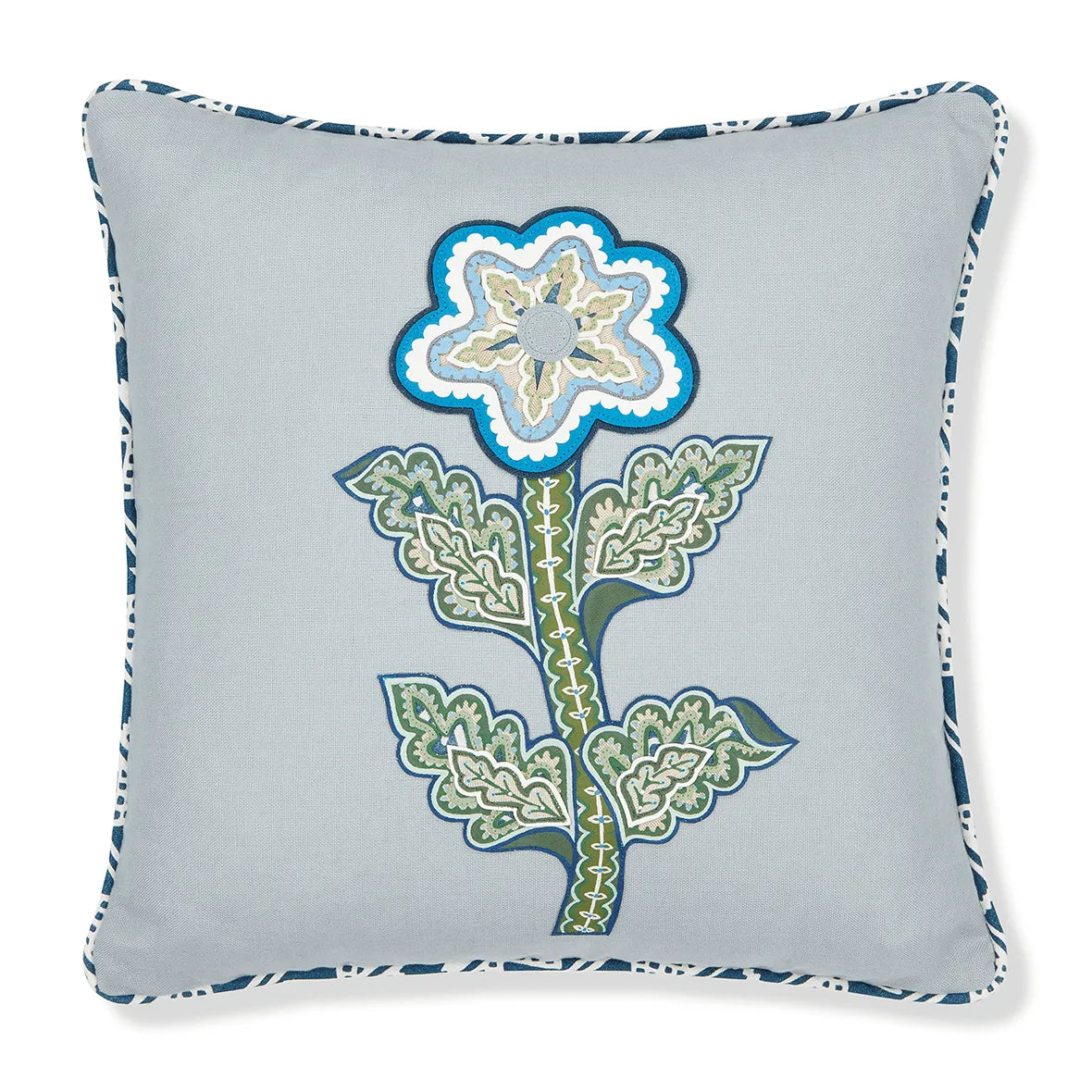 Cushion crafted from Volga plain weave linens and hand painted flower on one side by artist Natasha Hulse with piping in Alyosha Print Prussian blue. 100% LINEN. Cushion size 45x45cm.